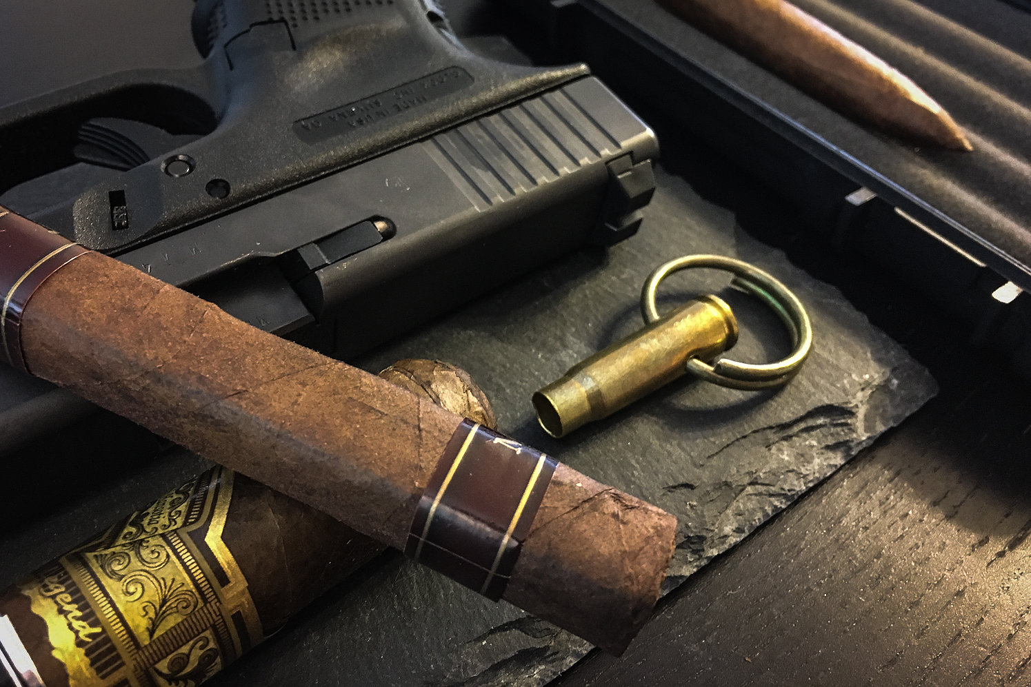 each time I’ve had no problems getting a solid, clean punch. It makes for a good draw on the cigar and most importantly doesn’t cause any damage to the wrapper. My only complaint with this thing is that there is no opening on the back of the shell to clear it so the cut caps do build up inside but this in only a minor issue. The bullet cigar punch is handcrafted with a real once-fired AK47 (7.62 x 39mm) bullet casing, and a real once-used (not sure what they did with the grenade after pulling the pin) grenade pin.
